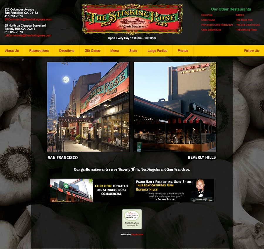 A slight redesign and a complete rebuild of the Stinking Rose web site, bring it up to speed with more contemnporary coding. I've also recently begun doing print layout and menu updates for them.